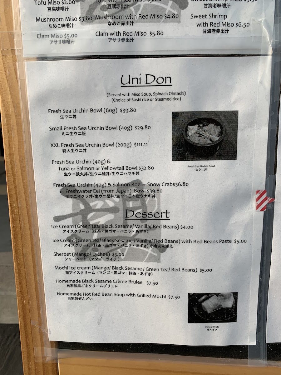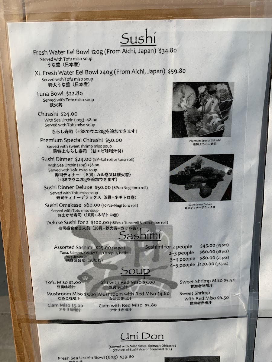 Sushi Nozomi in Torrance offers a well-curated menu that provides a mix of both traditional and creative Japanese dishes, perfect for any sushi enthusiast or those craving a high-quality meal. Their lunch menu features some standout options, each offering a unique combination of flavors and textures. For those seeking a refreshing and savory dish, the Uni (Sea Urchin) Udon is a must-try, offering a delightful balance between the creamy, rich uni and the comforting udon noodles. If you're in the mood for variety, the Sashimi & Fried Oyster Combination Lunch is an excellent choice, combining the fresh, delicate taste of sashimi with the crispy, satisfying texture of fried oysters. For a more traditional sushi experience, the Sushi Lunch Omakase allows diners to enjoy expertly crafted sushi prepared with the freshest ingredients available, providing a taste of the chef's selection. If you desire something a bit more indulgent, the Tempura & Filet Mignon Combination Lunch is a decadent option, offering the crispy delight of tempura paired with the rich, tender filet mignon. Each dish is carefully crafted to highlight the quality and authenticity of the ingredients, making Sushi Nozomi a standout spot for anyone craving an unforgettable Japanese dining experience. The menu offers something for everyone, whether you're in the mood for sushi, tempura, or a unique combination of both.
